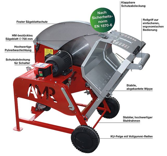 Serienmäßige Ausstattung: - Sägeblatt HM Ø 700/30 mm, 42 Zähne - Schnitttiefe: ca. 240 mm - elektrische Bremse - Fahrwerk mit 3. Rad und Transportgriff - Hochwertige Pulverbeschichtung - Wippenarretierung - Phasenwender, Überlastschutz und Sicherheitsendabschalter bei E-Motor - Not-Halt Hebel bei Zapfwellenantrieb - Schutzabdeckung nach EN-Norm 1870-6 - Einstellbarer Längenanzeiger - Rollgriff zur einfacheren Bedienung - Holzniederhalter - Stabile, gekantete Wippe - Breite Reifen - EG-Baumuster geprüft - Eigengewicht: 144 kg